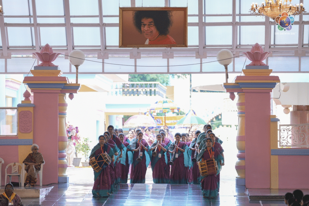The day’s proceedings commenced with a grand procession, heralded by the traditional Nadaswaram, Vedic chants, and the vibrant march of the Institute Band. The air was charged with reverence as each step of the procession seemed to echo a single feeling — gratitude for the Avatar’s descent and His infinite compassion.