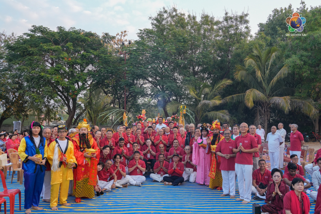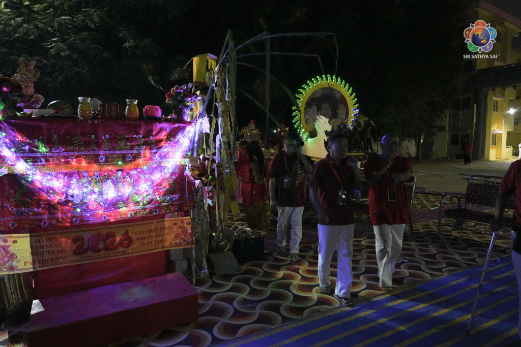 Devotees from Zone 5 countries of the Sri Sathya Sai Seva Global Council lovingly prepared a traditional altar behind the North 6 building within the ashram premises. Draped in auspicious red cloth, the altar was adorned with customary offerings—rice cakes, buns, symbolic pagodas, incense sticks and lamps—each arrangement reflecting reverence, gratitude and cultural richness.