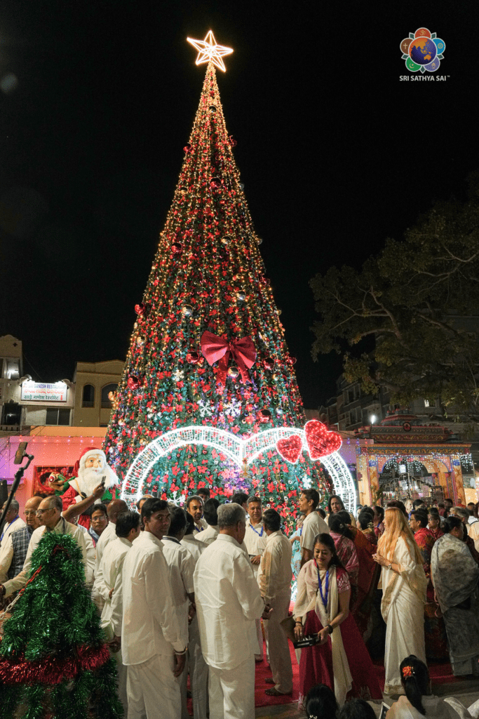 Christmas celebrations at Prasanthi Nilayam commenced in a joyful and prayerful atmosphere with the ceremonial inauguration of a magnificent 50-foot-tall Christmas tree, beautifully decorated and installed at the main entrance near the Ganesha Gate. Notably, last year’s tree stood at 30 feet, making this year’s grand installation even more special and eagerly awaited by devotees.