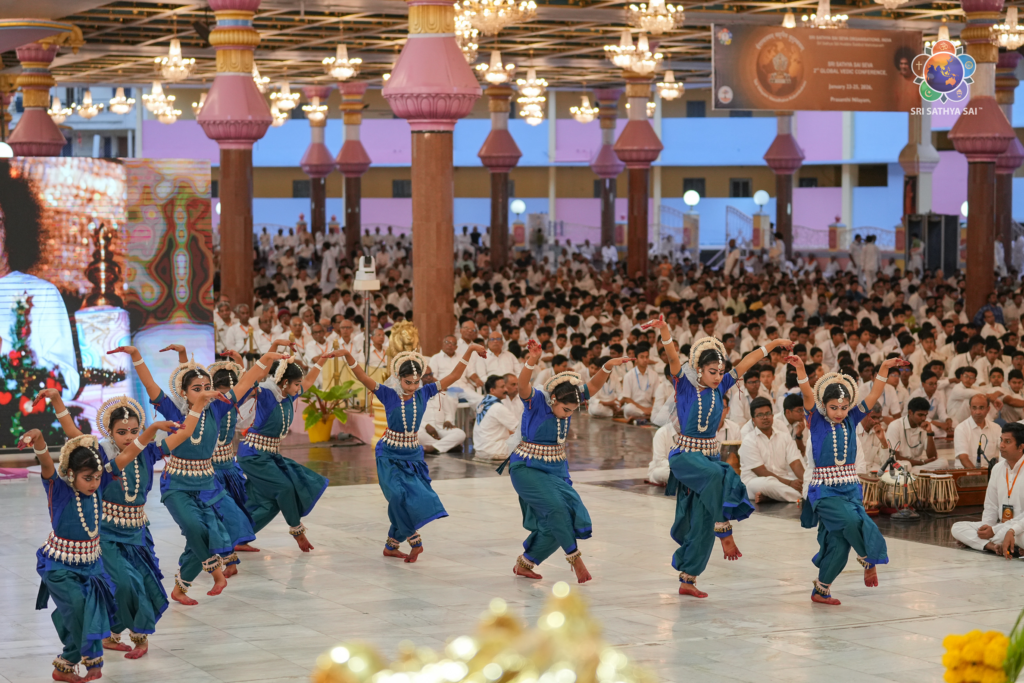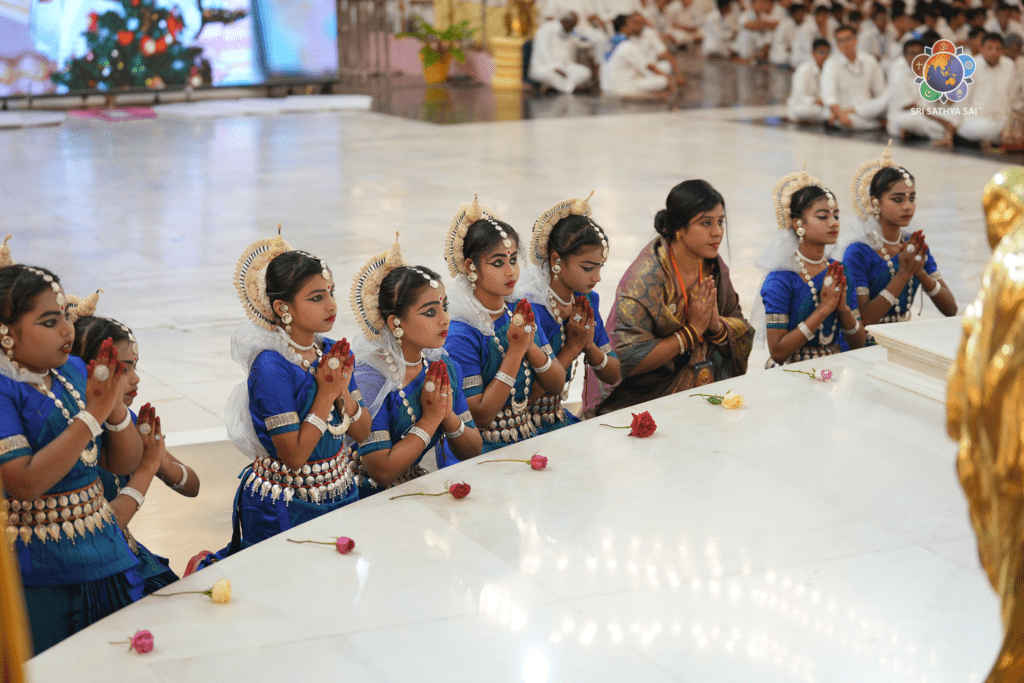 The evening concluded with a graceful cultural offering titled ‘Nateshwari Lasya’ by the students of Sri Sathya Sai School, Pankapal, Odisha, making their first-ever offering at Prasanthi Nilayam. Through the classical Odissi dance form, the young girls beautifully portrayed various facets of the Divine Mother, captivating the audience with their synchrony, expressive artistry, and devotion.