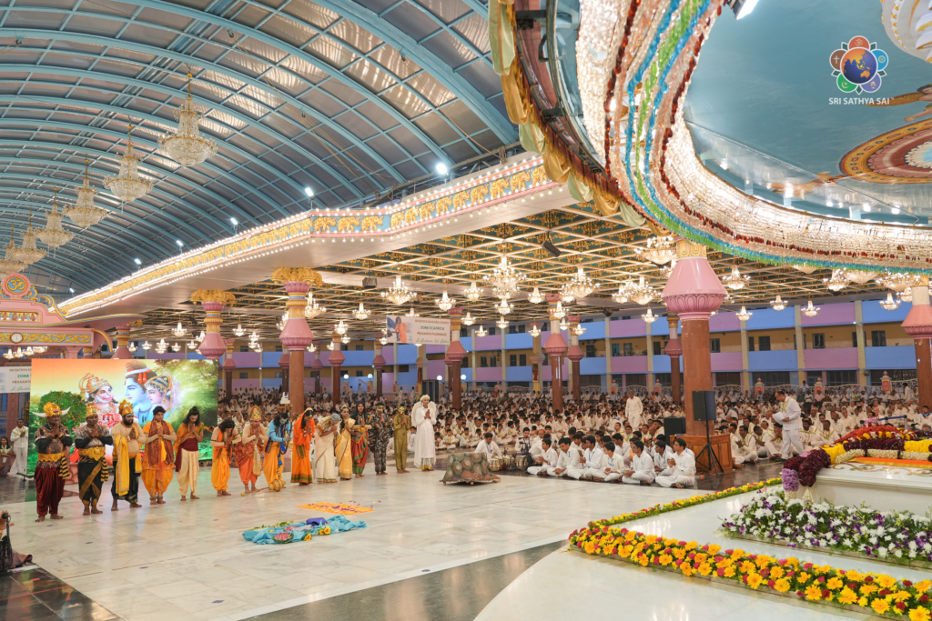 The evening witnessed a deeply stirring presentation by the devotees from Mauritius, who offered a soulful musical drama titled ‘Truth, Righteousness & the Golden Illusion.’ Drawing from the Aranya Kanda and Kishkinda Kanda of the timeless Ramayana, the drama beautifully depicted Rama not merely as the valorous prince of Ayodhya but as the eternal embodiment of Sathya and Dharma, guiding seekers through the labyrinth of illusion. Through the touching stories of Jatayu’s sacrifice, Sabari’s purity of devotion, and Hanuman’s unparalleled love, the drama portrayed how unwavering faith, humility, and righteousness draw the Lord ever nearer to the devotee. Melodious songs, graceful choreography, and heartfelt acting unfolded at the lotus feet of Sai Rama.