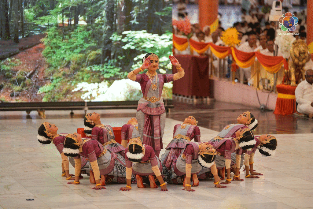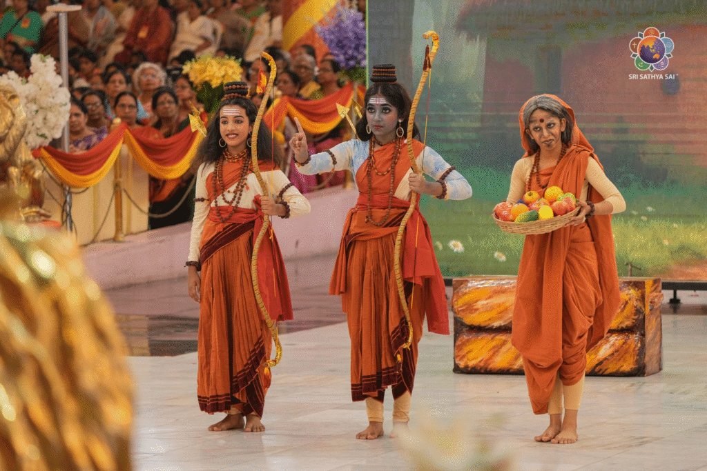 Following this, the Balvikas girls of Sri Sathya Sai Vidyapeeth, Srisailam, presented a deeply moving drama titled ‘The Path of True Devotion’—the story of the great devotee Sabari, who embodied the truth that compassion for all beings is the highest expression of devotion to God. The children, through vibrant dances, colourful costumes, and heartfelt dialogues, powerfully portrayed how Sabari’s life of love, humility, and service culminated in receiving the supreme blessing of Lord Rama Himself.