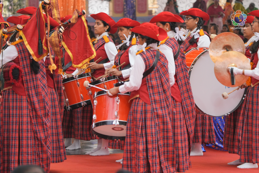 The welcoming strains of “Swagatam” felt like Swami Himself embracing His children once again. A unique highlight was the presentation by the Bagpipers Band, whose majestic notes blended discipline with devotion—an echo of the values Swami instilled in His students. Narration after narration wove a seamless thread of remembrance, leading into beloved songs where emotion overflowed and eyes moistened, as alumni relived the warmth of Swami’s love as Mother, Father, Teacher, and God.