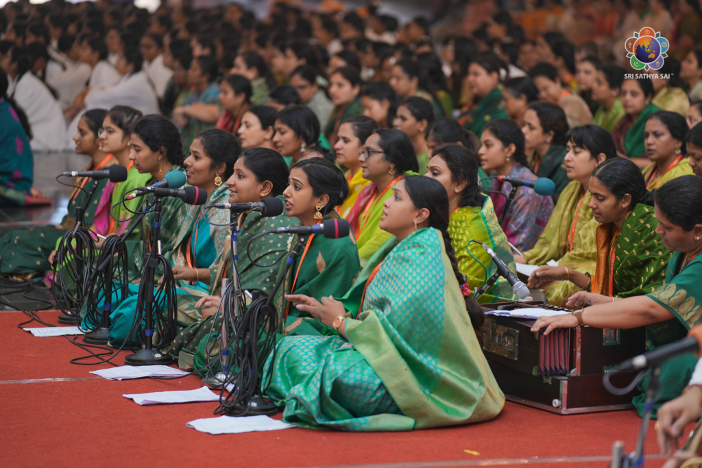 As the sacred dawn of December 31 unfolded at Prasanthi Nilayam, the morning was gently suffused with love, gratitude, and remembrance as the alumni of the Sri Sathya Sai Primary and Higher Secondary Schools gathered to offer their hearts at His Lotus Feet. The main theme, ‘Premarpanam – Echoes of Divine Love’, found its purest expression in the morning musical offering titled ‘Premamrutam’, which was a homecoming of hearts. The collective voice of devotion rose in earnest with the “Oh Lord” prayer, followed by an evocative introductory narration that gently carried the audience through memories of classrooms, corridors, playgrounds, and, above all, moments of Swami’s silent yet transformative grace.