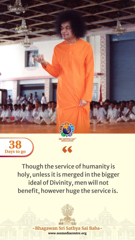 Devotion should not be confined to the four walls of the shrine-room or the few minutes you perform Dhyana (meditation). It is a full-time Sadhana (spiritual discipline). Your devotion has to be expressed as worship of everyone, as a living embodiment of Divinity. See God in everyone, even in persons whom you regard as your enemies. Practise that broad and inclusive type of Love. How can you derive happiness by showing love and reverence to a stone idol that does not respond or reflect the feelings? Living beings will return appreciation and gratitude and wish you well. You can see joy growing in their faces. That will confer satisfaction on you. If you cannot educate yourself to love your fellow man, how can you follow the path of dedication to God? Find out the difficulties and troubles burdening others and help them, to the extent you can, to tide over them, and to lead their lives so that they may not recur. Learn to live with other men; share your joys and sorrows with others; be forbearing, not overbearing.