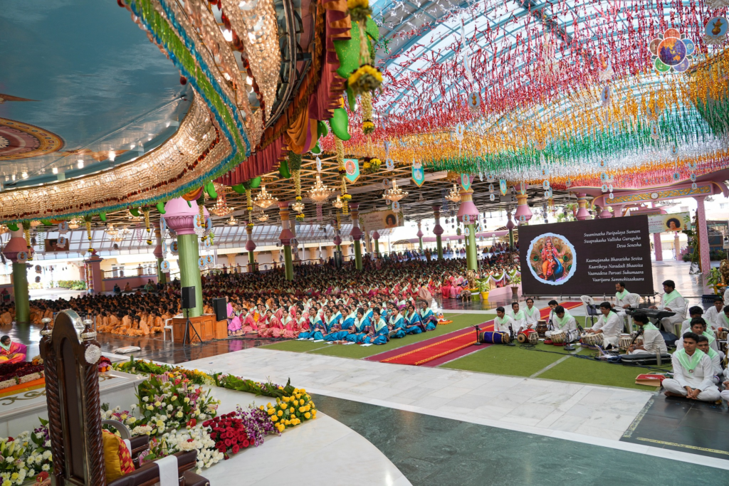 The program then continued with a soulful musical offering by the ladies, who presented a bouquet of ten devotional songs in diverse Indian languages. Each composition, rendered with devotion and harmony, reflected the spirit of unity in diversity and stood as a loving expression of gratitude at the Divine Lotus Feet.