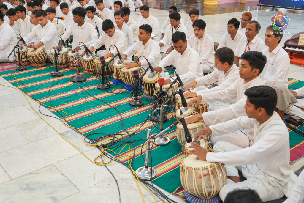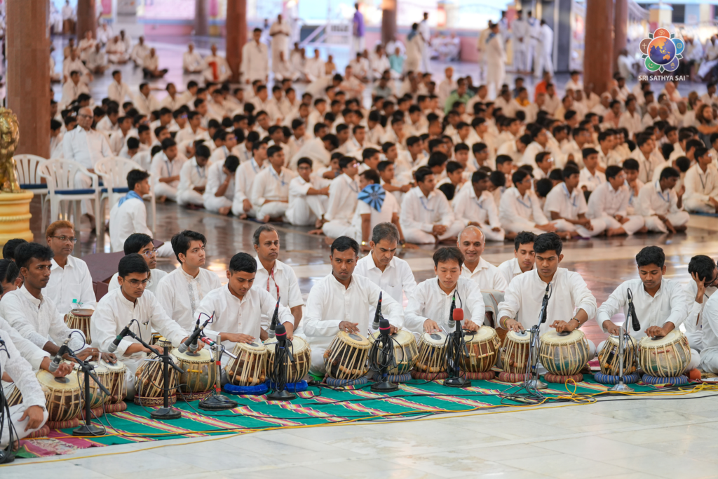 The Department of Performing Arts at SSSIHL presented ‘Sai Shiva Namostute’, a soulful musical offering at the Sai Kulwant Hall this evening that seamlessly blended technical mastery with deep devotion. The program commenced with an invocation to the Divine Mother through ‘Saraswati Ma,’ followed by the classic Thyagaraja Kriti ‘Shobhillu Saptaswara’ and a serene Hindustani ‘Chota Khyal’ in Raag Maru Bihag. The performance reached a vibrant peak with ‘Shankara Shiva Bhole’, featuring a dynamic solo by eight percussionists, before concluding with the energising ‘Shiv Shankar Ke Charano Mein’. Throughout the recital, the students demonstrated exceptional skill in classical improvisation, filling the atmosphere with a profound sense of peace and reverence for Lord Shiva.
