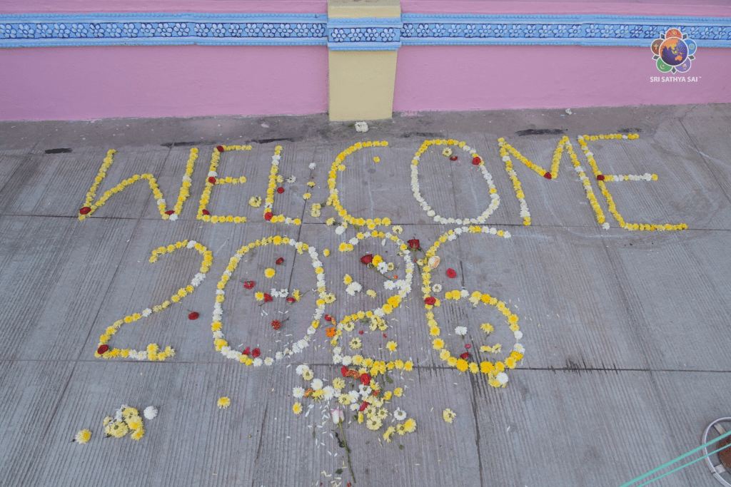 The evening session of the New Year celebrations commenced on a sacred note with Vedam chanting, the traditional Vedam procession, and bhajans offered by the alumni of the Sri Sathya Sai Institute of Higher Learning (SSSIHL), sanctifying the atmosphere with collective devotion.