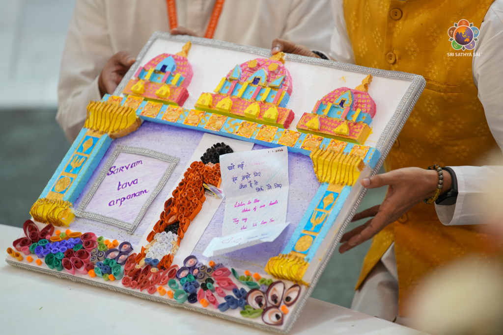 The traditional slow march followed this, reminiscent of the blessed journey Bhagawan would take from Yajur Mandir to Sai Kulwant Hall, accompanied by the Premabandham Flag, lovingly remembered as the flag blessed by Swami in 2004. On this sacred occasion, the alumni also presented ‘Vidyullekha’, the quarterly alumni newsletter, which chronicles life-transforming experiences and service initiatives undertaken across the globe. In addition, ‘A Bridge Across Time’, the 33rd volume of the Bhajan Album, was reverentially offered at His Divine Lotus Feet.