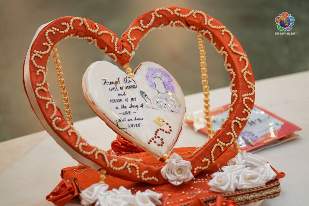 One of the most touching moments of the evening was the offering of meticulously handcrafted gratitude cards to their beloved Mother Sai. Each card stood as a labour of love—intricate in design, rich in symbolism, carefully layered with colours, textures, drawings, calligraphy, and thoughtful detailing. These were not mere cards, but silent prayers shaped by patient hands and loving hearts.