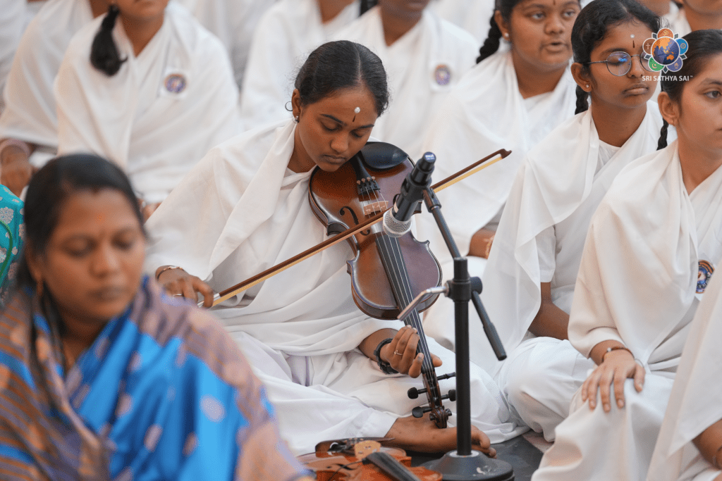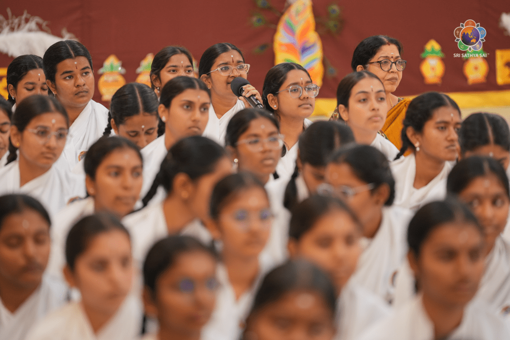In the sanctified presence of Prasanthi Nilayam, where every heartbeat echoes with His love, the students of Classes X and XII (Girls) of Sri Sathya Sai Higher Secondary School offered an evening soaked in gratitude, devotion, and surrender. Titled ‘Sarvasva Samarpan’, this heartfelt musical offering of the children who live away from their physical houses yet have grown securely in the home of their Divine Parent. For these young girls, Prasanthi has been home, Swami their Mother and Father, Guide and Guardian.