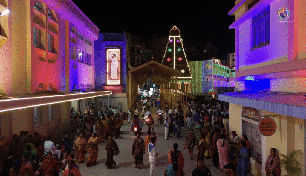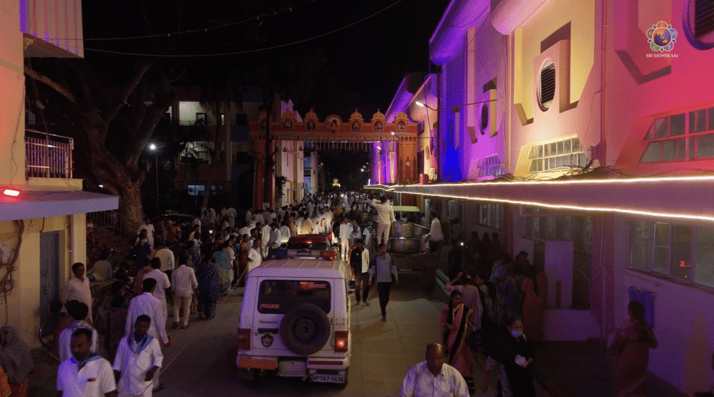 Even as the temperature dipped last night, adding a serene stillness to the air, a gentle chill swept across the Ashram. Yet, the sound of claps rang louder and stronger — keeping rhythm with the devotees’ tireless vigil through the night. Their eyes beheld His divine form in the sacred Sannidhi, their lips ceaselessly chanting His Name — Sai Ram, Govinda, Allah, Yesu, Buddha, Mahaveera — echoing the very essence of the unity of all faiths that Bhagawan stood for.