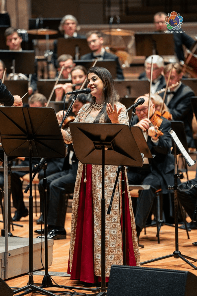 The world-renowned Prague FILMharmonic Orchestra was specially commissioned for this production, and the concert was conducted by eminent German maestro Prof Dr Michael Kohler and orchestration and arrangements by celebrated composer Robin Hoffmann. The music production and music direction was led by Mr Sai Shravanam, who curated and guided the masterful integration of the Indian compositions with Western Orchestration. The concert featured legendary Indian classical stalwarts Pandit Ajoy Chakraborty, Vidushi Kaushiki Chakraborty, and celebrated flautist Flute Navin, alongside members of the Prasanthi Bhajan Group – singers Mr S Ravikumar and Mr Anirudh Srinivasan, who played a pivotal role in the concert. Together, they presented a spiritually charged repertoire that included iconic compositions such as Why Fear When I Am Here, Manasa Bhajare, Love Is My Form, Brahmamokkate and Madhura Mohana, along with other beloved pieces that resonate deeply within the Sathya Sai fraternity.