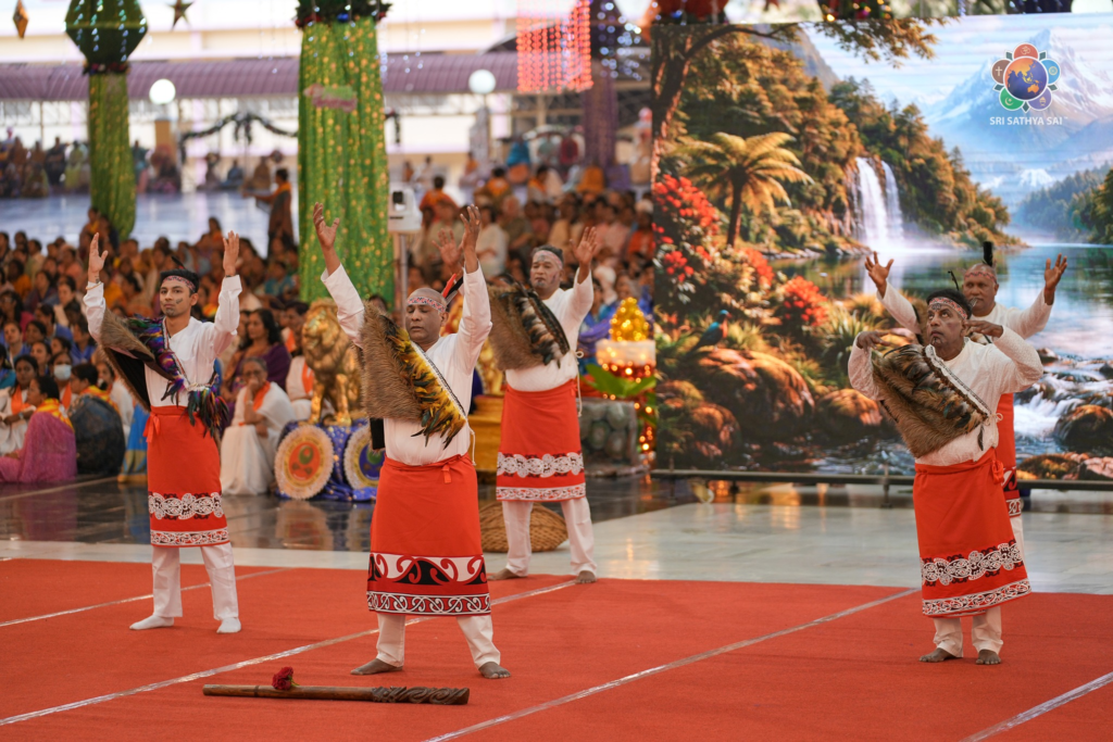 This lofty ideal found a vibrant and moving expression in the drama presented by the New Zealand devotees. The narrative follows the journey of a scientist from Auckland whose attempt to witness Bhagawan’s advent through a time-travel experiment leads him into an unexpected spiritual odyssey. Overshooting his destination, he arrives in Aotearoa in 1825, where wise Māori elders introduce him to ‘Te Wairua’ — the all-pervading life force flowing through nature and humanity alike.